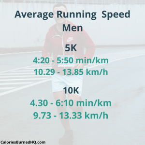 The average running speed for men is about 6.6 mph or 10.62 km/h and for women it’s 5.7 mph or 9.17 km/h.