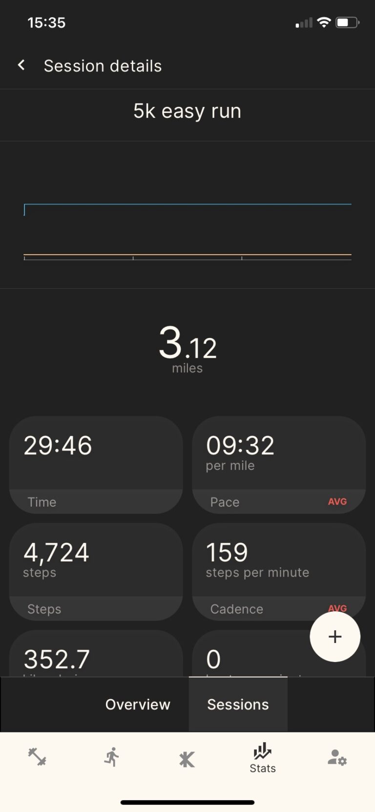 After your run is completed, Kinni provides a workout report with session stats. The report includes a breakdown of details like time, pace, steps, steps per minute, calories, and heart rate beats per minute.