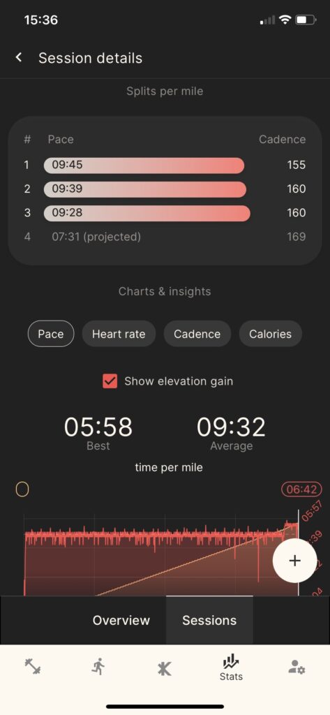 It also shows the pace for splits and provides graphs for pace, heart rate, cadence, and calories, along with elevation gain.